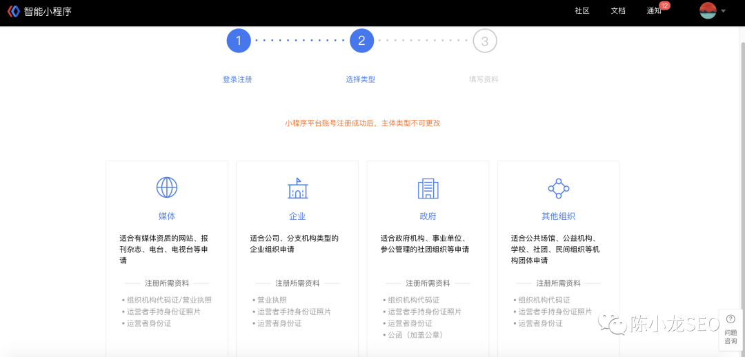 目前支持的主体类型:媒体、企业、政府、其他组织。主体类型、主体名称一旦提交后将无法更改。